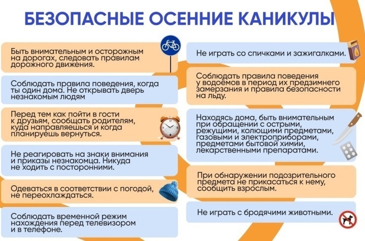 Инструктаж для обучающихся об охране жизни и здоровья на период осенних каникул: Соблюдать правила дорожного движения в осеннее время. Быть осторожными и внимательными во время движения по дороге, особенно в вечернее время суток. Не разговаривать с незнакомыми людьми, не садиться в незнакомый транспорт. Осторожно обращаться с газовыми и электроприборами, предметами бытовой химии, лекарственными препаратами. Не подходить, не трогать руками подозрительные предметы. В случае обнаружения сообщить взрослым, в полицию. Находясь дома, не открывать дверь незнакомым людям. 🧊Не пребывать на водоёмах в период осенних каникул. Всегда сообщать родителям о своем местонахождении. Не находиться на улице после 22.00 часа без сопровождения взрослых. Соблюдать правила поведения в общественных местах. Не увлекайтесь длительным просмотром телевизора, многочасовой работой за компьютером.