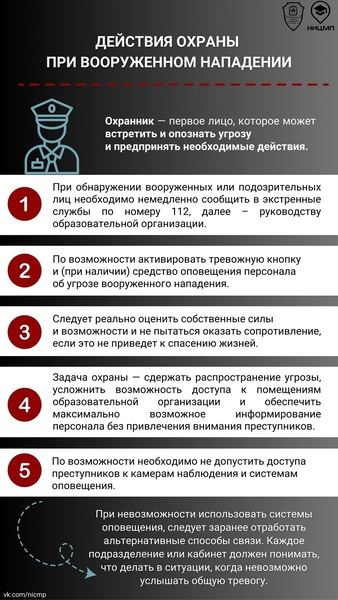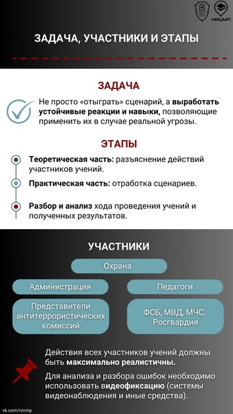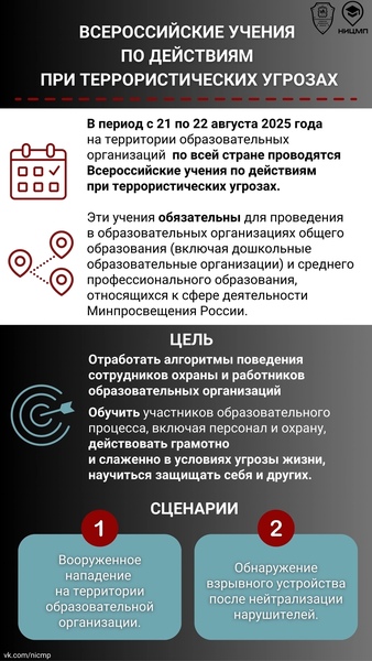 28 августа 2025 года на территории образовательных организаций общего образования (включая дошкольные образовательные организации) и среднего профессионального образования по всей стране прошли учения по отработке комплексного сценария «Действия сотрудников охраны и работников образовательных организаций при вооруженном нападении на объект (территорию) образовательной организации и обнаружении после нейтрализации нарушителей размещенного в здании образовательной организации взрывного устройства».