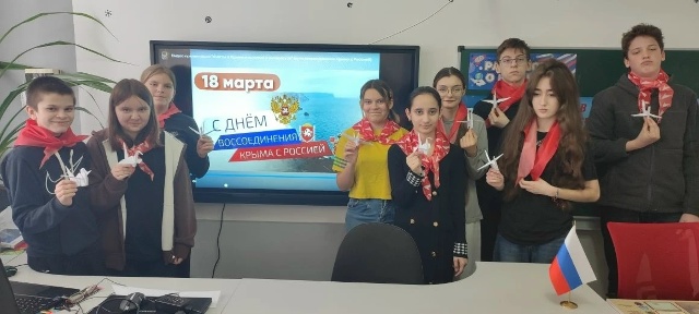 В МБОУ «Леоновская СОШ» 18 марта в первичном отделении Движение Первых проведено мероприятие в рамках Всероссийской акции "Одна страна - одна история!", посвященное дню воссоединения Крыма с Россией. 19 марта 2026 В МБОУ «Леоновская СОШ» 18 марта в первичном отделении Движение Первых проведено мероприятие в рамках Всероссийской акции "Одна страна - одна история!", посвященное дню воссоединения Крыма с Россией. Ребята В ходе мероприятия участники с увлечением слушали рассказ об истории Крыма, о событиях, которые произошли в марте 2014 года, о достопримечательностях и природных красотах полуострова. Они также узнали о важной роли Крыма в истории и современном развитии России. В честь этого особенного дня была проведена акция «Журавлик». Ученики сделали оригами журавлей, как символ благополучия и мира на земле. Благодаря усердию и стараниям ребят, каждый журавлик получился оригинальным. Крым-это Россия! Россия-это Крым!