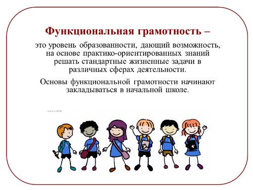 В качестве основных составляющих функциональной грамотности выделены: математическая, читательская, естественно-научная, финансовая грамотности, глобальные компетенции и креативное мышление. Главной характеристикой каждой составляющей является способность действовать и взаимодействовать с окружающим миром, решая при этом разнообразные задачи.