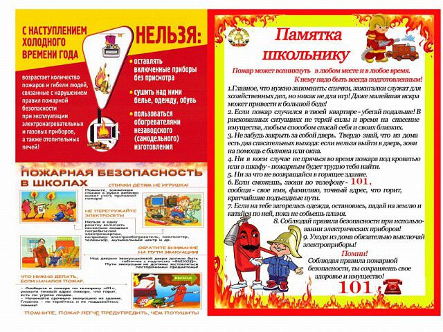 ПАМЯТКА О ПРАВИЛАХ ПОЖАРНОЙ БЕЗОПАСНОСТИ. 31 июля 2024 Уважаемые родители!!! Пожар может возникнуть в любом месте и в любое время, поэтому к нему надо быть подготовленным. Мы предлагаем запомнить простейшие правила, которые помогут спастись от огня и дыма, так и и вашим детям. 1.Не допускайте шалости детей с источниками открытого огня, в том числе со спичками и зажигалками. 2.Не разрешайте самостоятельно эксплуатацию электрических, в том числе электронагревательных приборов, детьми - от них, включённых в сеть и оставленных без присмотра, может произойти пожар. 3.Не доверяйте топку печей детям. 4.Не допускайте нагрева незнакомых предметов, упаковок из - под порошковых красок, аэрозольных упаковок, как сами так и контролируйте, чтобы это не делали дети. 5.Не разрешайте самостоятельное ( без взрослых) применение свечей и хлопушек, не устраивайте фейерверки и другие и световые пожароопасные эффекты, вблизи сгораемых предметов. 6.Разъясните своим детям, что если случился пожар в квартире, то необходимо немедленно покинуть её, выбежав на улицу или к соседям, не забыв при этом закрыть за собой дверь. 7. Научите детей, что ни в коем случае нельзя прятаться во время пожара под кроватью иди в шкафу - пожарным будет трудно их найти. 8. Усвойте сами и поясните это детям, что: - из дома есть два спасательных выхода: если нельзя выйти в дверь, зовите на помощь с балкона или из окна. - если на вас загорелась одежда, остановитесь, падайте на землю и катайтесь, пока не собьёте пламя. -если вы обожгли руку - подставьте её под струю холодной воды, после чего обратитесь к врачу. - если в подъезде огонь или дым, не выходите из квартиры, откройте окно или балкон и зовите на помощь. -во время пожара нельзя пользоваться лифтом: он может застрять между этажами. - при обнаружении пожара первом делом позвоните в пожарную охрану, назовите своё имя и адрес, не переоценивайте свои силы, только адекватно оценив ситуацию, вы можете приступить к самостоятельному тушению огня. ЕЩЁ РАЗ НАПОМИНАЕМ НОМЕРА ТЕЛЕФОНОВ ПОЖАРНОЙ ОХРАНЫ: - ПРИ ВЫЗОВЕ СО СТАЦИОНАРНОГО ТЕЛЕФОНА - 01; ПРИ ВЫЗОВЕ С МОБИЛЬНОГО ТЕЛЕФОНА 101 ИЛИ 112
