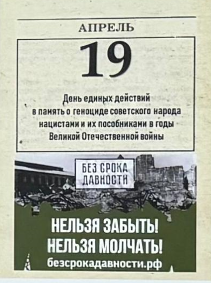 Анонс проведения Дня единых действий 21 апреля 2025 Анонс проведения Дня единых действий Великая Отечественная война стала тяжелым испытанием для народов СССР. Это война, в которой решалось, будет ли у народов Советского Союза будущее вообще.Генеральным планом «ОСТ» предусматривалась немецкая колонизация большей части территории Советского Союза, что означало принудительное выселение и уничтожение местного населения. Были не важны национальность,возраст,социальное происхождение, пол – ведь речь шла об освобождении территории для переселения немецких колонистов. Итог преступлений нацистов против гражданского населения СССР выражается в страшном соотношении числа жертв среди военных и мирных жителей. Война унесла жизни 26,6 млн. чел. Из них практически половина – это потери среди мирного населения на оккупированной территории – 13 684 692, в том числе 11 520 379 человек погибли в результате карательных операций, холода, голода, издевательств. Остальные 2 164 313 погибли в изгнании на принудительных работах. Всего на принудительные работы с оккупированной территории было вывезено 5 269 513 советских граждан. Уже в годы Великой Отечественной войны по мере освобождения оккупированной нацистами территории стали очевидны масштаб и зловещность преступлений против мирного населения. 19 апреля – особая дата в сохранении исторической правды о преступлениях нацистов. В этот день в 1943 году был издан Указ Президиума Верховного Совета СССР № 39 «О мерах наказания для немецко-фашистских злодеев, виновных в убийствах и истязаниях советского гражданского населения и пленных красноармейцев, для шпионов, изменников родины из числа советских граждан и для их пособников». Появление этого документа было первым фактом признания целенаправленной и масштабной политики нацистов и их пособников по уничтожению мирного населения на оккупированной территории и наказуемости таких преступлений. Этот Указ Президиума Верховного Совета СССР стал правовым основанием большой работы по установлению и расследованию преступлений нацистов против советского народа, которая велась с ноября 1942 г. Чрезвычайной государственной комиссией по установлению и расследованию злодеяний немецко- фашистских захватчиков. Цель Дня единых действий: сохранение исторической правды о преступлениях нацистов и их пособников в отношении мирных советских граждан в годы Великой Отечественной войны на оккупированной территории. Показать через эту призму исторической памяти, что действия Красной Армии и единение советского народа в достижении Победы спасли наше государство и его граждан от полного уничтожения. 19 апреля 1943 г. можно по праву рассматривать как предтечу формулировки в национальном и международном уголовном праве ответственности за преступления по статье «геноцид».